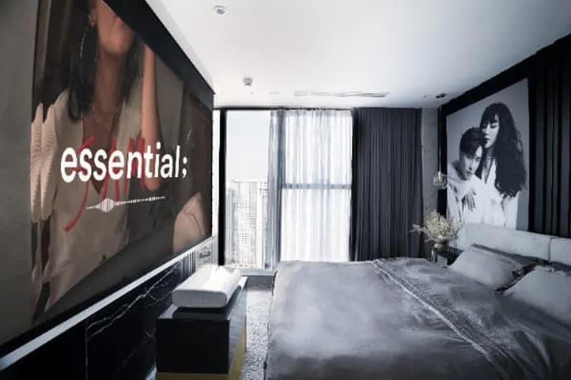Phòng ngủ tối giản với các màu trung tính như xám, trắng và đen, cùng cửa sổ kính suốt từ trần đến sàn mang lại ánh sáng cho căn phòng. Trong phòng ngủ, gia chủ cũng đặt một chiếc máy chiếu lớn sắc nét, tạo cảm giác chân thật như xem phim ngoài rạp.