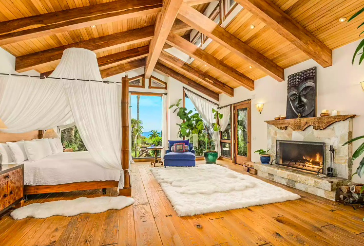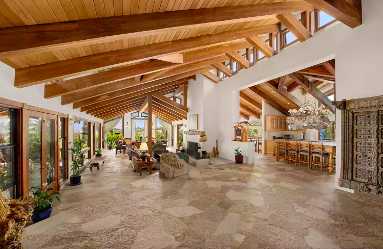 Ngôi nhà được thiết kế hài hoà với thiên nhiên với nhiều không gian ngoài trời, các phòng tận dụng ánh sáng tự nhiên. Phòng ngủ chính có lò sưởi, cửa sổ kéo từ sàn lên tới trần để phóng tầm mắt ra ngoài trời với view biển, núi....