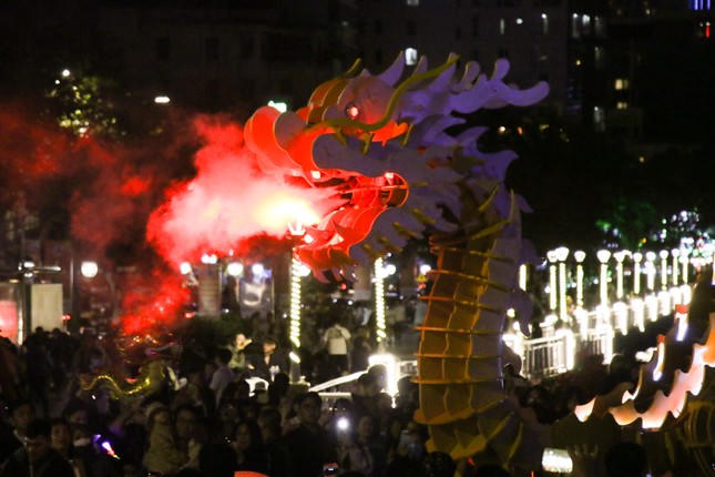 Linh vật rồng "phun nước, phun lửa" níu chân hàng trăm người dân và du khách dừng lại theo dõi. (Ảnh: Giang Thanh - Tiền phong)
