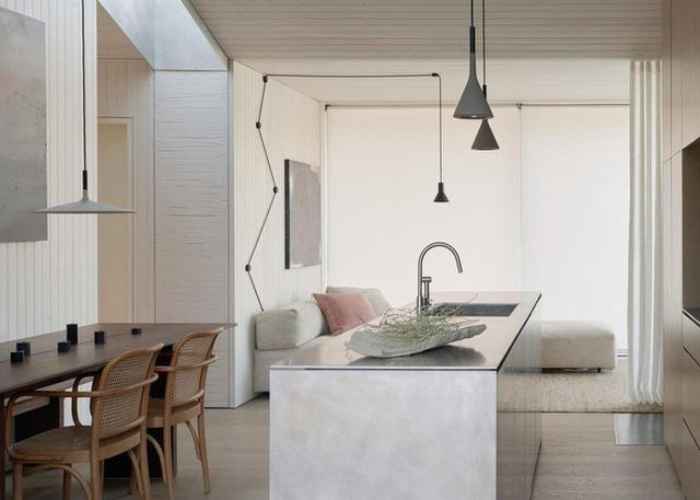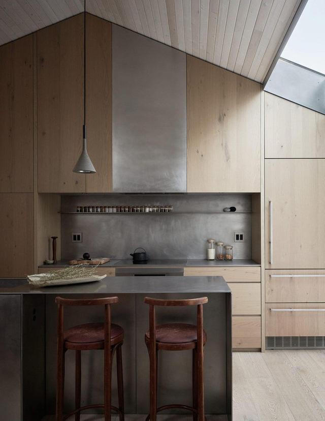 Sàn nhà được làm từ gỗ sồi và gỗ thông quét vôi trắng . Trong nhà bếp, thép không gỉ đã được sử dụng cho mặt bàn và backsplash. Ngôi nhà có 3 giếng trời, cho phép ánh sáng tự nhiên thoải mái vào nhà. |