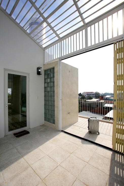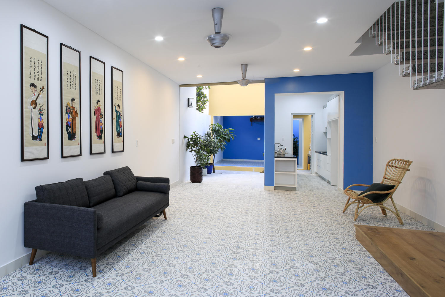 Không gian mở được bố trí khắp nhà để đáp ứng nhu cầu về một không gian sống thoải mái, rộng rãi và thoáng mát. Tại tầng 1, sân vườn được đặt cạnh bếp, tạo kết nối giữa không gian phòng khách và phòng làm việc. Tầng 2 giảm diện tích sinh hoạt để tạo ra một ban công phía sau nhìn xuống sân vườn, trong khi tầng 3 có ban công ở cả hai mặt trước và sau để phơi đồ và làm bể chứa nước.