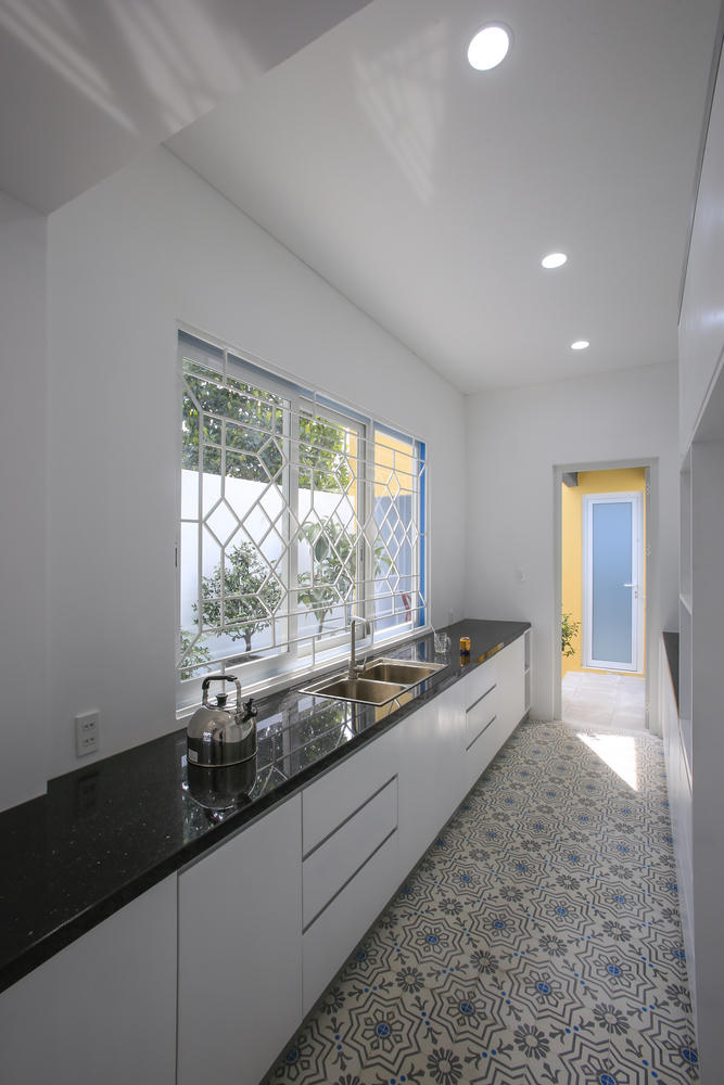 Ngôi nhà cũng được trang bị nhiều đèn trần thay vì chỉ dùng một bóng đèn tuýp, giúp ánh sáng lan tỏa đều và tràn ngập. Tông màu trắng cũng được áp dụng cho toàn bộ tường và kệ bếp, tạo cảm giác căn bếp trở nên rộng rãi hơn.