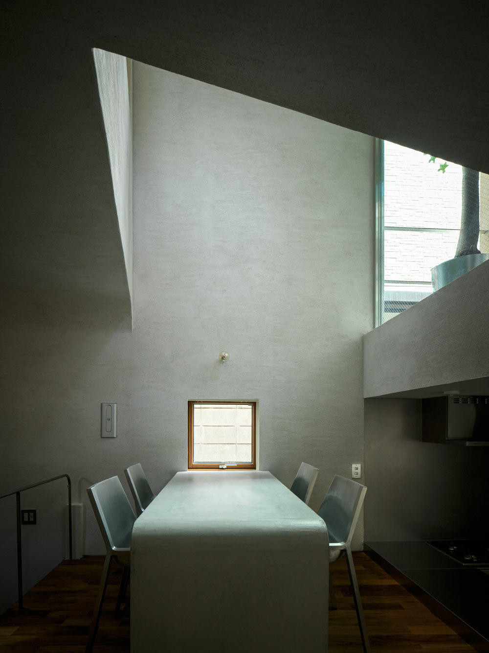 Bên trong ngôi nhà, kiến trúc sư đã tạo ra một mạng lưới các phòng từ sinh hoạt chung đến riêng tư, giúp tối ưu hóa không gian nhỏ hẹp. Những phòng khép kín được dành cho tác phẩm nghệ thuật và cuộc họp, trong khi các khu vực mở hơn được sử dụng để gặp gỡ và làm việc. Một sơ đồ lệch tầng thông minh giúp tận dụng mảnh đất hẹp, với hai tầng ở phía trước và ba tầng ở phía sau.
