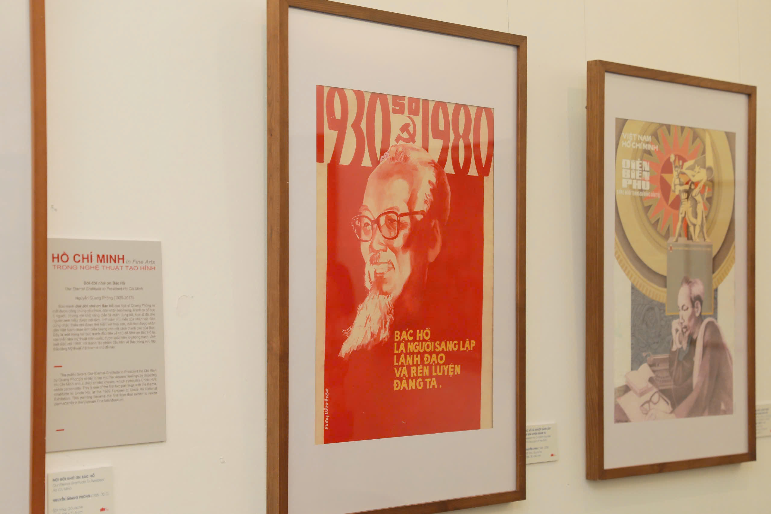 Tiêu biểu như: các tác phẩm Cậu Coong học khai tâm của họa sĩ Văn Giáo, Mùa xuân Bác về Pắc Bó của họa sĩ Dương Tuấn, Bác Hồ đọc Tuyên ngôn của họa sĩ Nguyễn Dương… Những hình ảnh Hồ Chủ tịch ở chiến khu Việt Bắc qua các tác phẩm Hồ Chủ tịch làm việc ở Chiến khu Việt Bắc của họa sĩ Phan Kế An, tác phẩm Bác Hồ làm việc ở Việt Bắc của họa sĩ Nguyễn Văn Tỵ; Bác đi chiến dịch qua tác phẩm Rời lều cỏ Bác tiếp tục hành quân của họa sĩ Trọng Kiệm, Bác đi công tác của họa sĩ Trần Đình Thọ, Nguyễn Thụ, Nguyễn Đại Lượng…