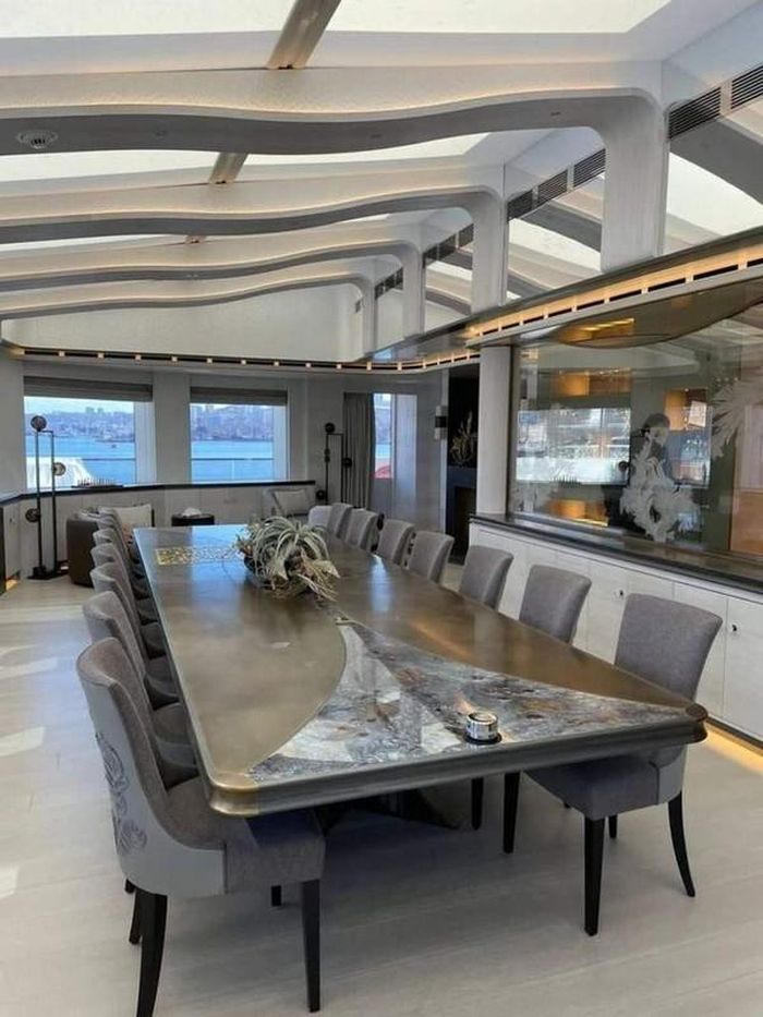 Bàn ăn kết hợp giữa gỗ và đá cẩm thạch, đủ chỗ cho 14 người. (Ảnh: Luxurylaunches) |