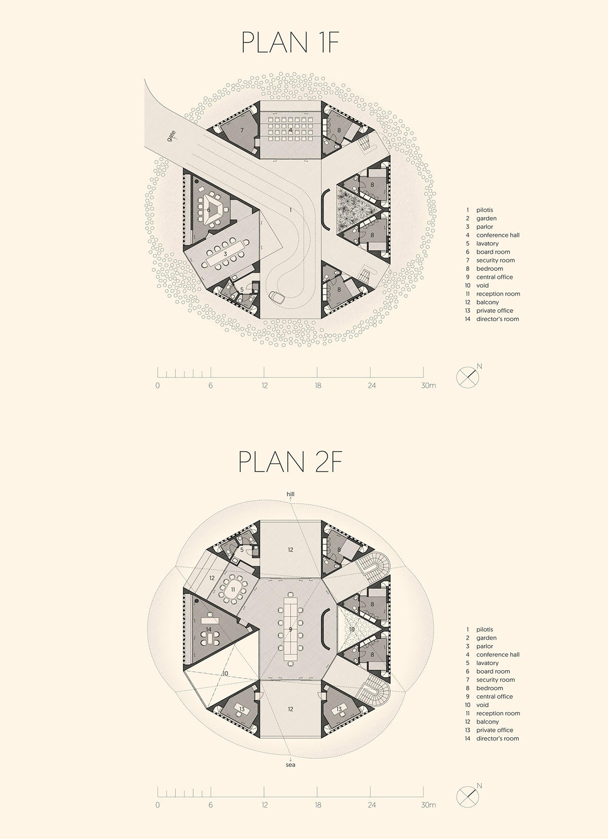 Tòa nhà được chia thành 7 khối hình tam giác, bao gồm cả không gian riêng và chung. Bên trong các khối tam giác là phòng ngủ và văn phòng riêng. Không gian giữa là văn phòng trung tâm và phòng khách.