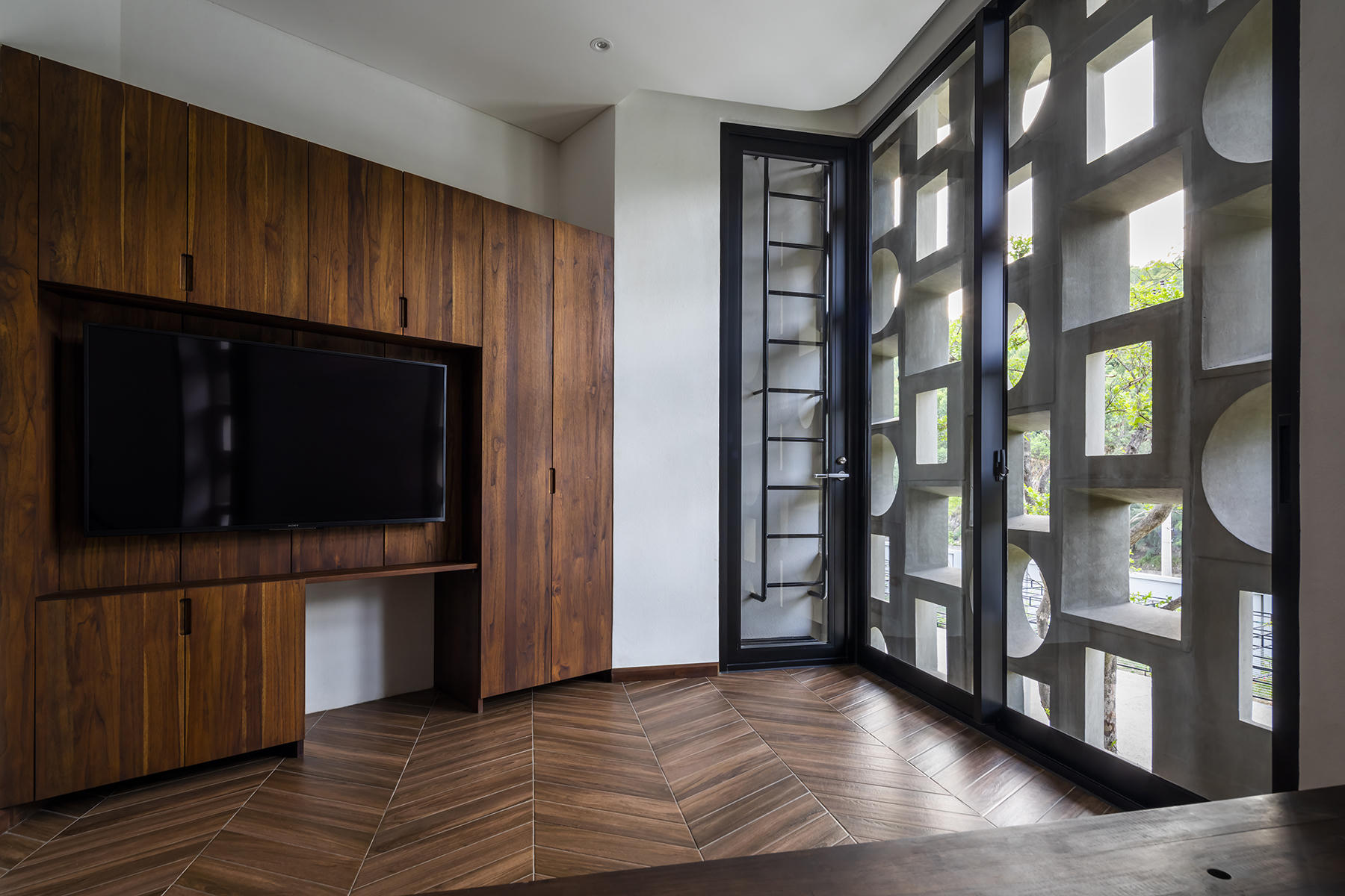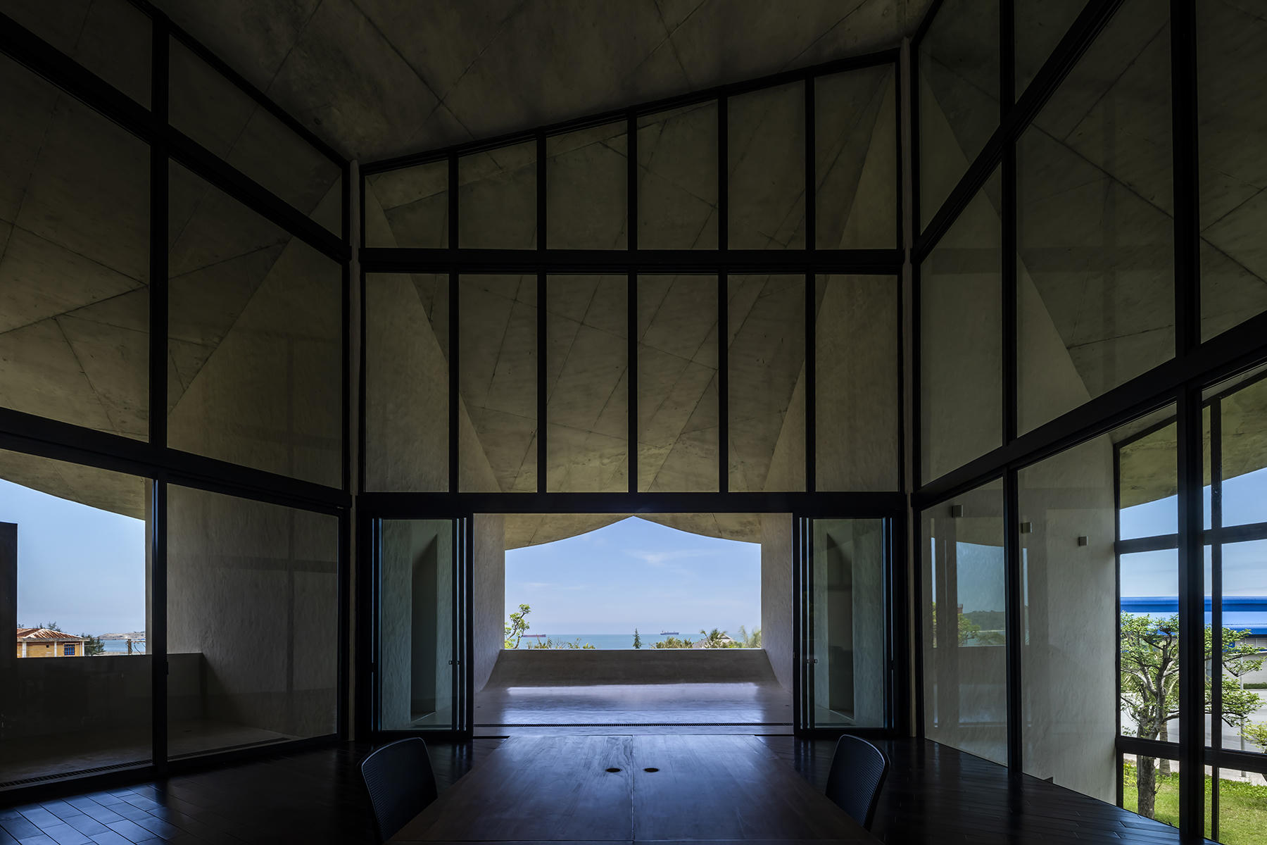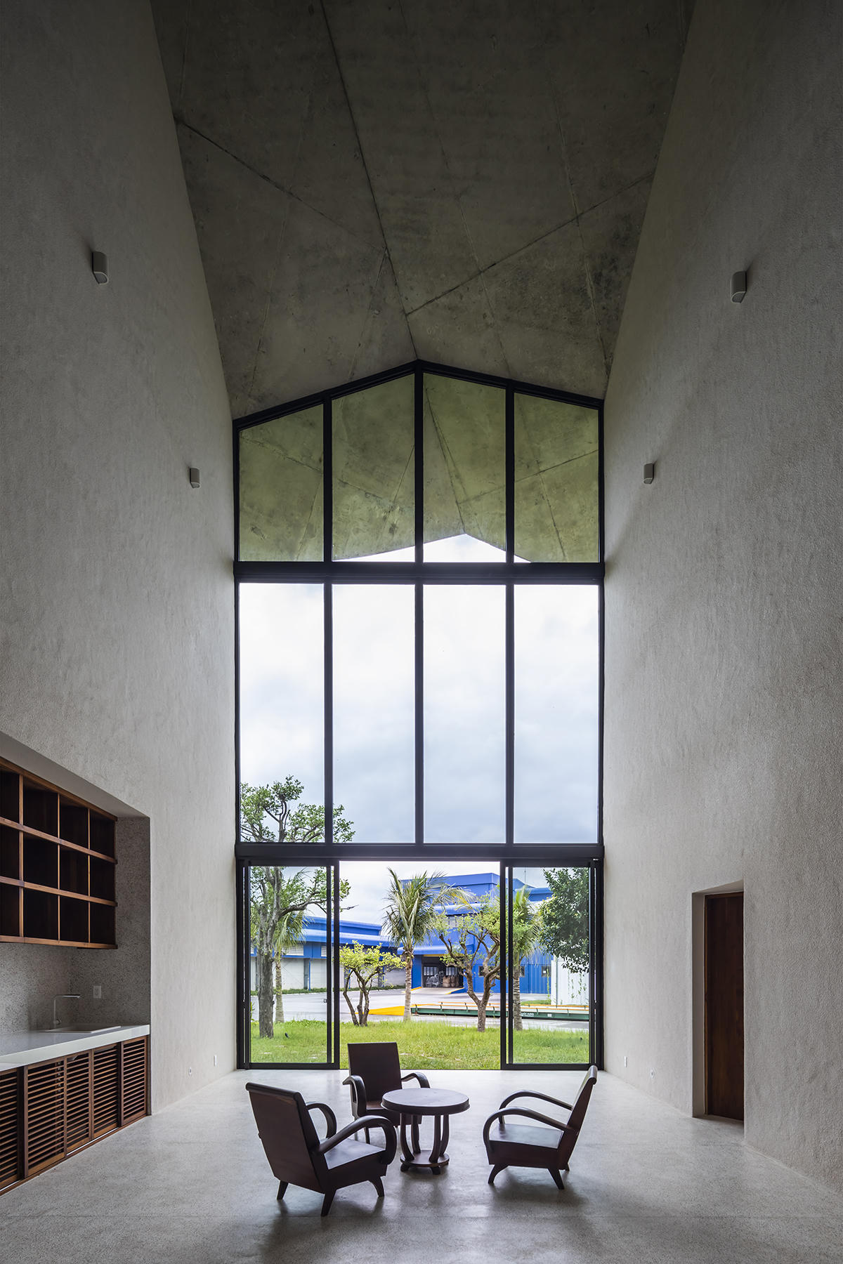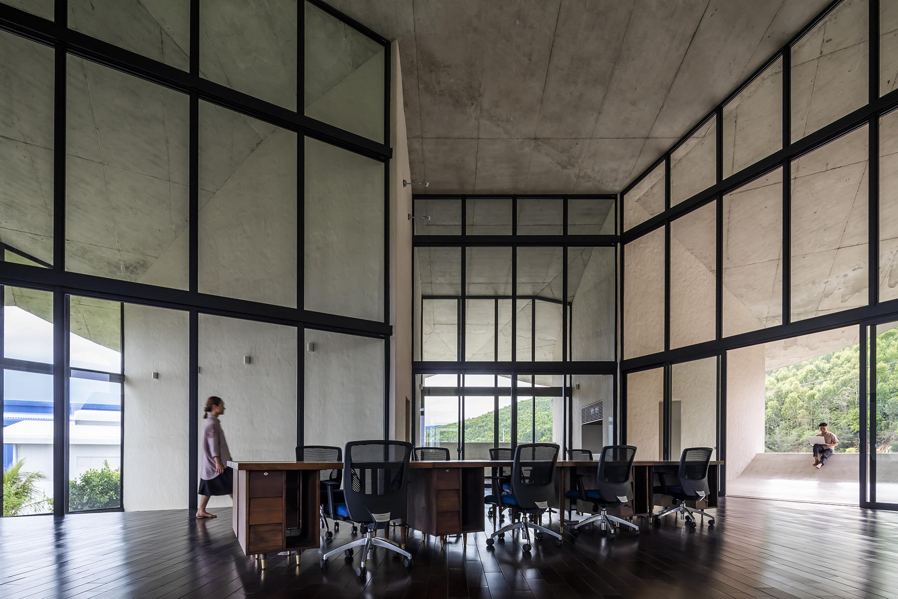 Các lát cắt hình chữ V tạo nên những không gian riêng hình tam giác hướng ra bên ngoài, đồng thời mở ra một không gian rộng lớn ở giữa là nơi làm việc chung cũng như tổ chức các hoạt động tập thể.