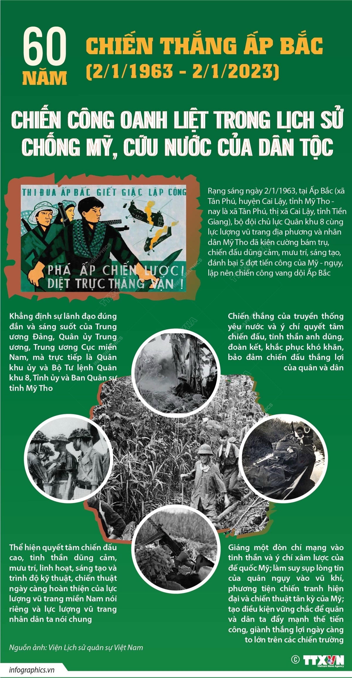 Cách đây tròn 60 năm, vào ngày 2/1/1963, tại Ấp Bắc (xã Tân Phú, huyện Cai Lậy, tỉnh Mỹ Tho - nay là xã Tân Phú, thị xã Cai Lậy, tỉnh Tiền Giang), quân và dân ta đã làm nên Chiến thắng Ấp Bắc lẫy lừng.