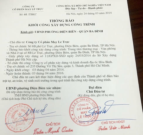 Sở Xây dựng Hà Nội cấp Giấy phép xây dựng số 11/GPXD-SXD ngày 24/03/2014 cho công trình Trung tâm thương mại - Văn phòng - Nhà ở để bán và cho thuê tại 8B phố Lê Trực; Công ty cổ phần may Lê Trực đã gửi Thông báo khởi công xây dựng công trình số 01/TBKC ngày 24/03/2014 và đã được UBND phường Điện Biên kiểm tra hồ sơ, xác nhận khởi công theo quy định của pháp luật về xây dựng, gồm các công trình: