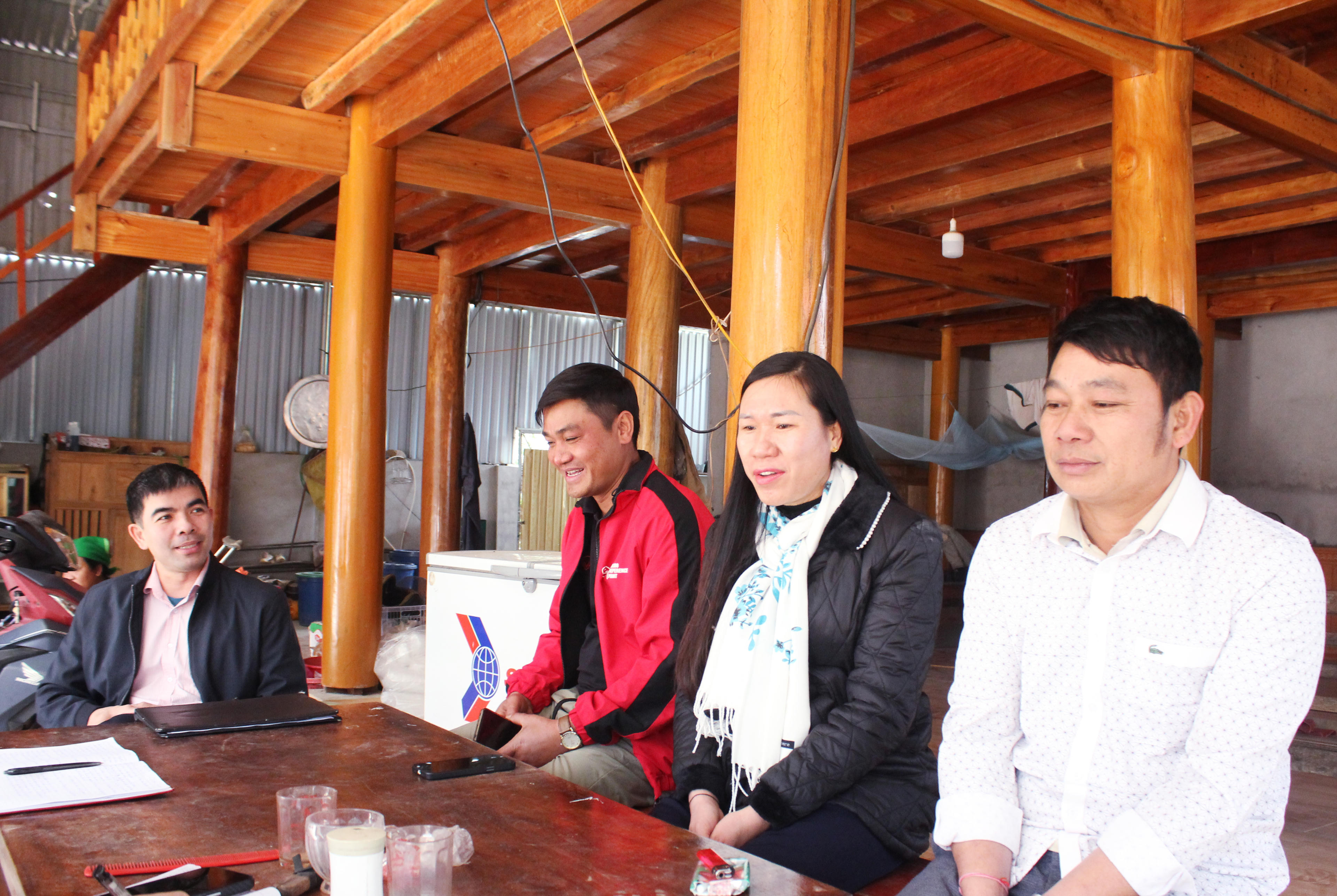 Chị Hoài (thứ 2 từ trái qua) vui vẻ chia sẻ câu chuyện xuất khẩu lao động với đại diện lãnh đạo UBND xã Chiêu Lưu và Ngân hàng Chính sách xã hội huyện Kỳ Sơn. |