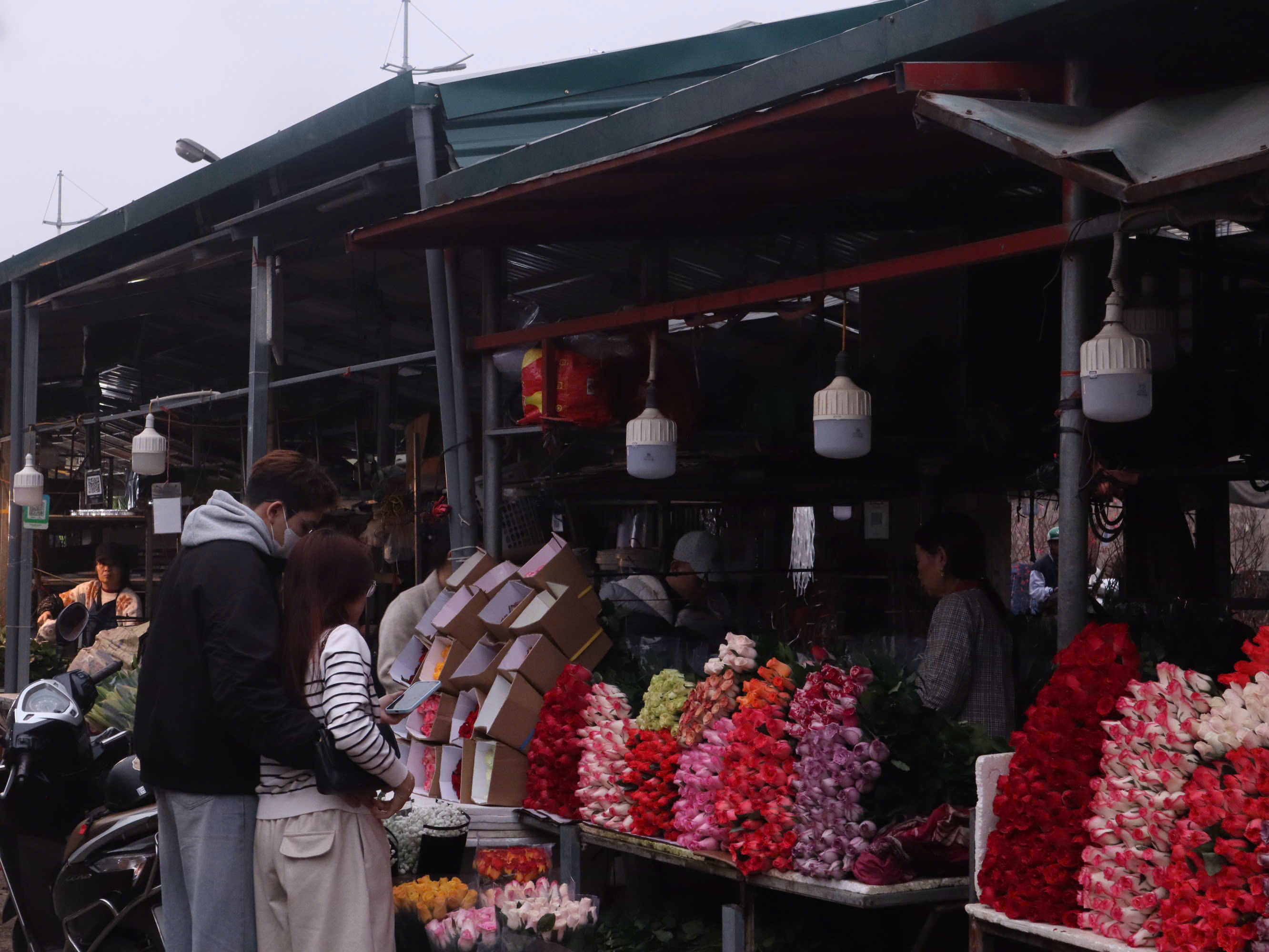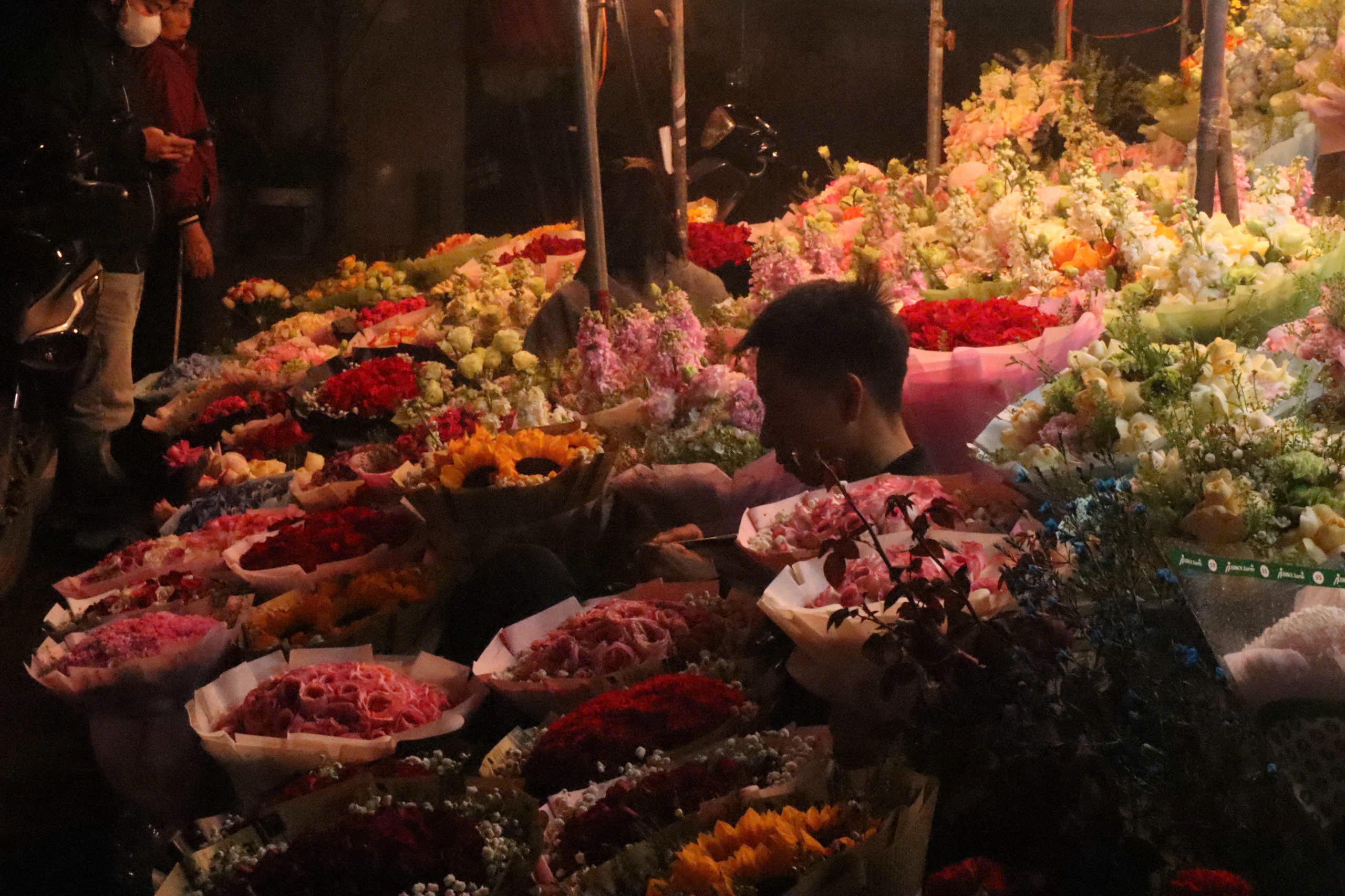 Khi hoàng hôn buông xuống, ánh đèn đường hắt nhẹ lên những cánh hoa còn sót lại, chợ hoa như khoác thêm một lớp áo trầm tĩnh.