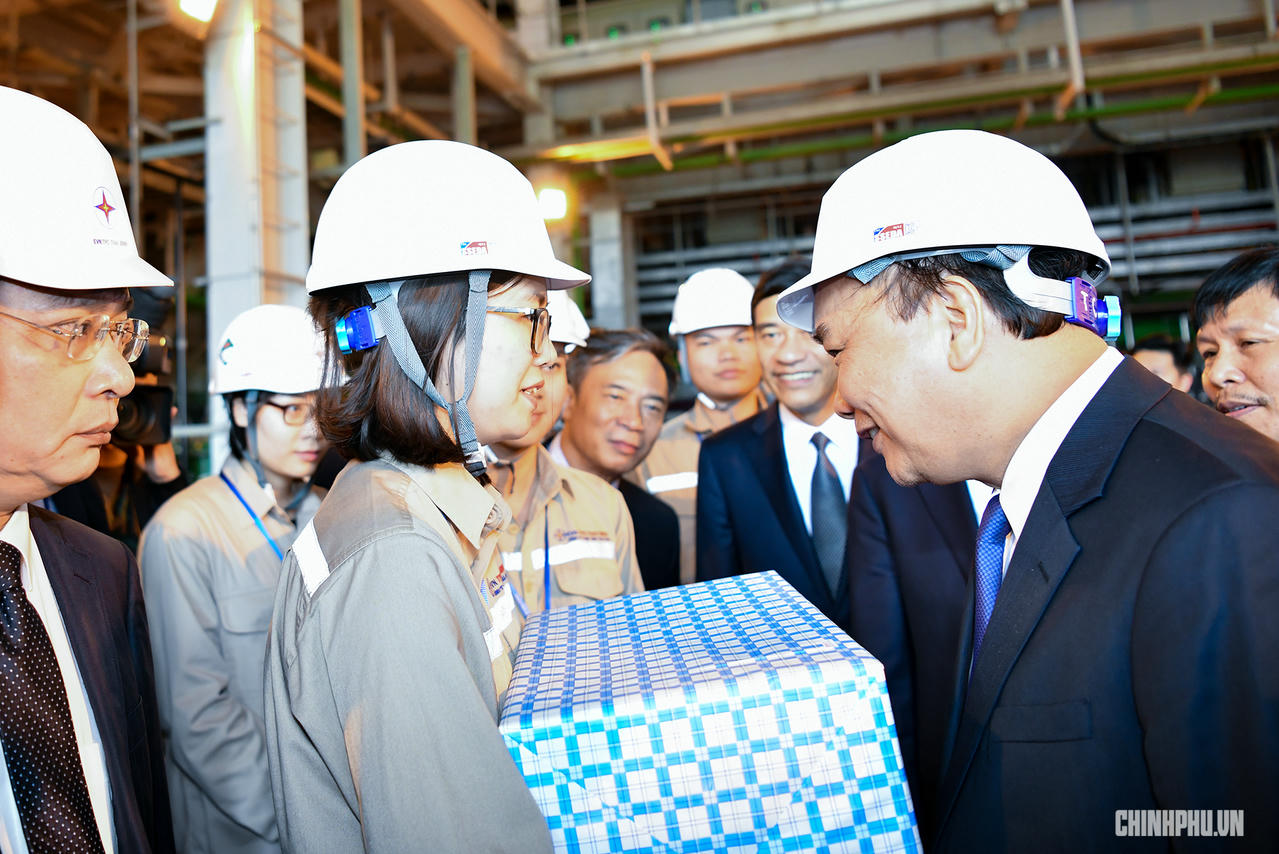 | Thủ tướng Nguyễn Xuân Phúc tặng quà cho công nhân nhà máy. |
