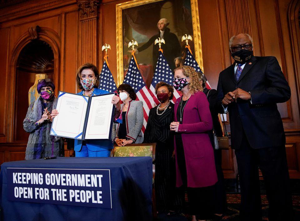 Chủ tịch Hạ viện Hoa Kỳ Nancy Pelosi công bố nghị quyết vừa ký để tránh Chính phủ Hoa Kỳ đóng cửa trong buổi lễ trên Đồi Capitol ở Washington, Hoa Kỳ, ngày 30/9/2021. Ảnh: Reuters |