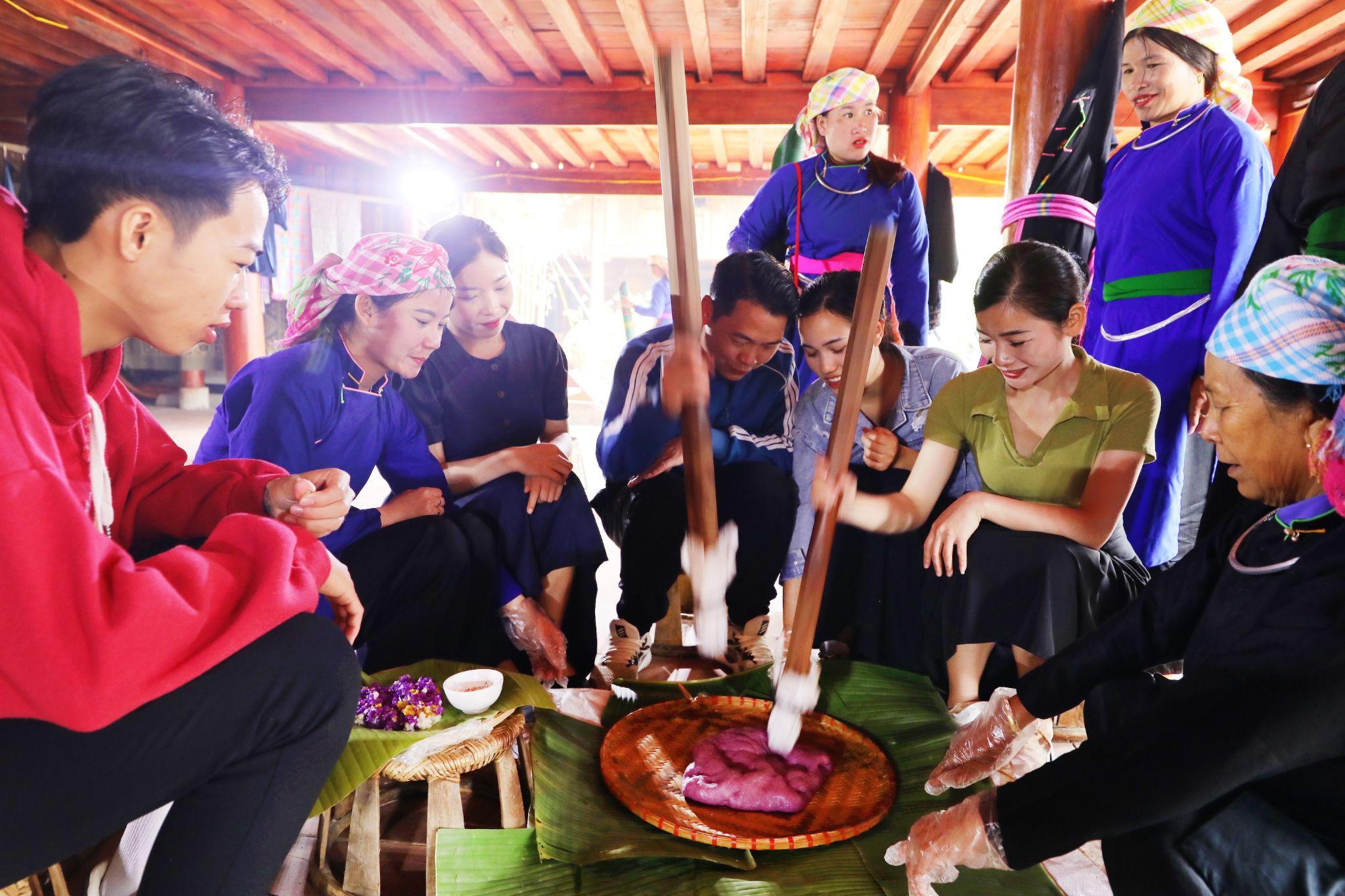 Du khách trải nghiệm làm bánh ở nhà Tày, Không gian văn hóa Tây Bắc. |