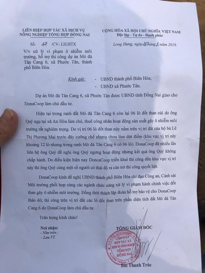 Văn bản có đoạn: “Trong ranh đất mỏ đá Tân Cang 6 có sáu lò đốt than củi gây ô nhiễm môi trường rất nghiêm trọng” và đề nghị “UBND TP Biên Hòa chỉ đạo Công an, Cảnh sát môi trường phối hợp cùng các ngành chức năng xử lý vi phạm hành chính việc đốt than gây ô nhiễm môi trường”.
