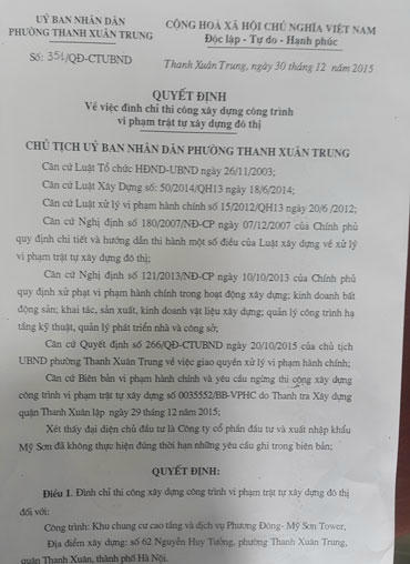 Ngày 30/12/2015, UBND phường Thanh Xuân Trung đã có quyết định đình chỉ thi công đối với công trình vì vi phạm trật tự đô thị.