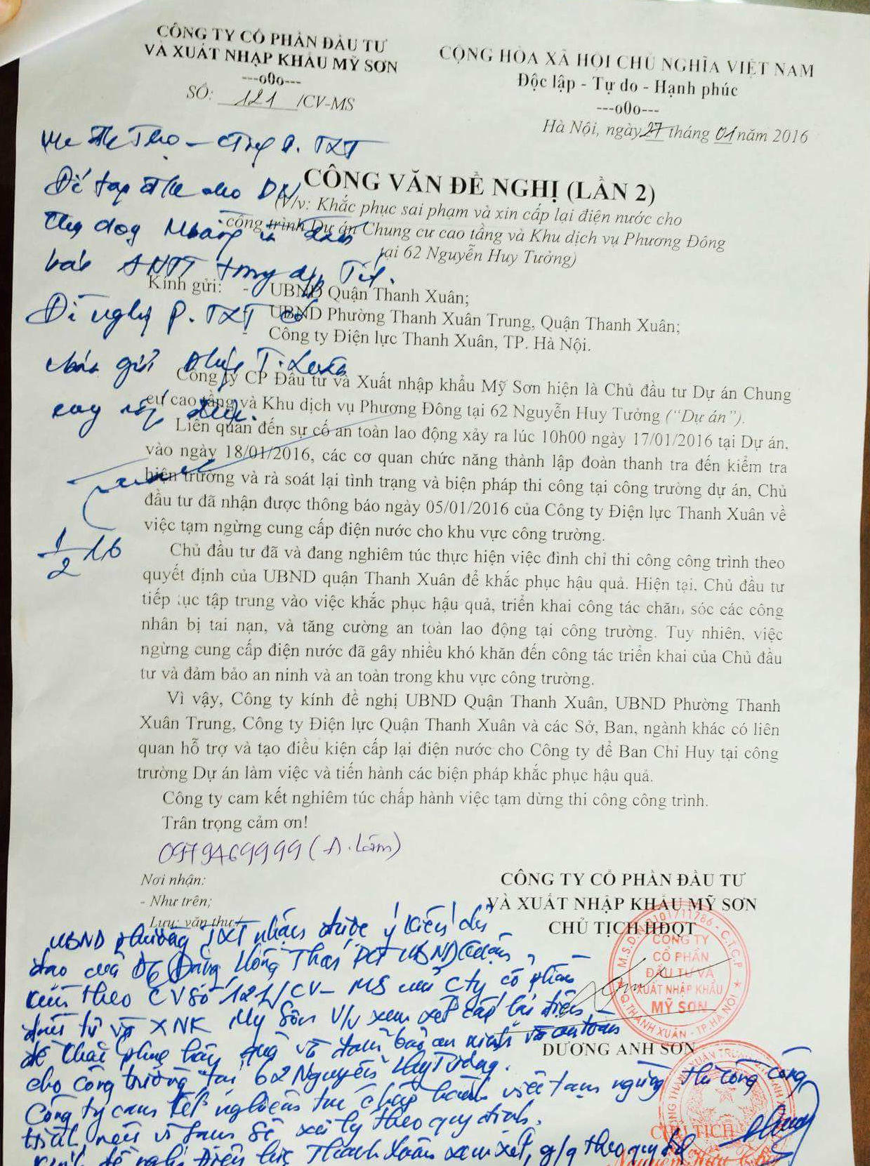 Ngày 27/1/2016, Công ty CP Đầu tư và Xuất nhập khẩu Mỹ Sơn đã liên tiếp có công văn số 121 gửi lần 2 đến UBND Quận Thanh Xuân và UBND phường Thanh Xuân Trung về việc khắc phục sai phạm và "xin" cấp lại điện nước cho công trình dự án Chung cư cao tầng và khu dịch vụ Phương Đông tại số 62 Nguyễn Huy Tưởng.