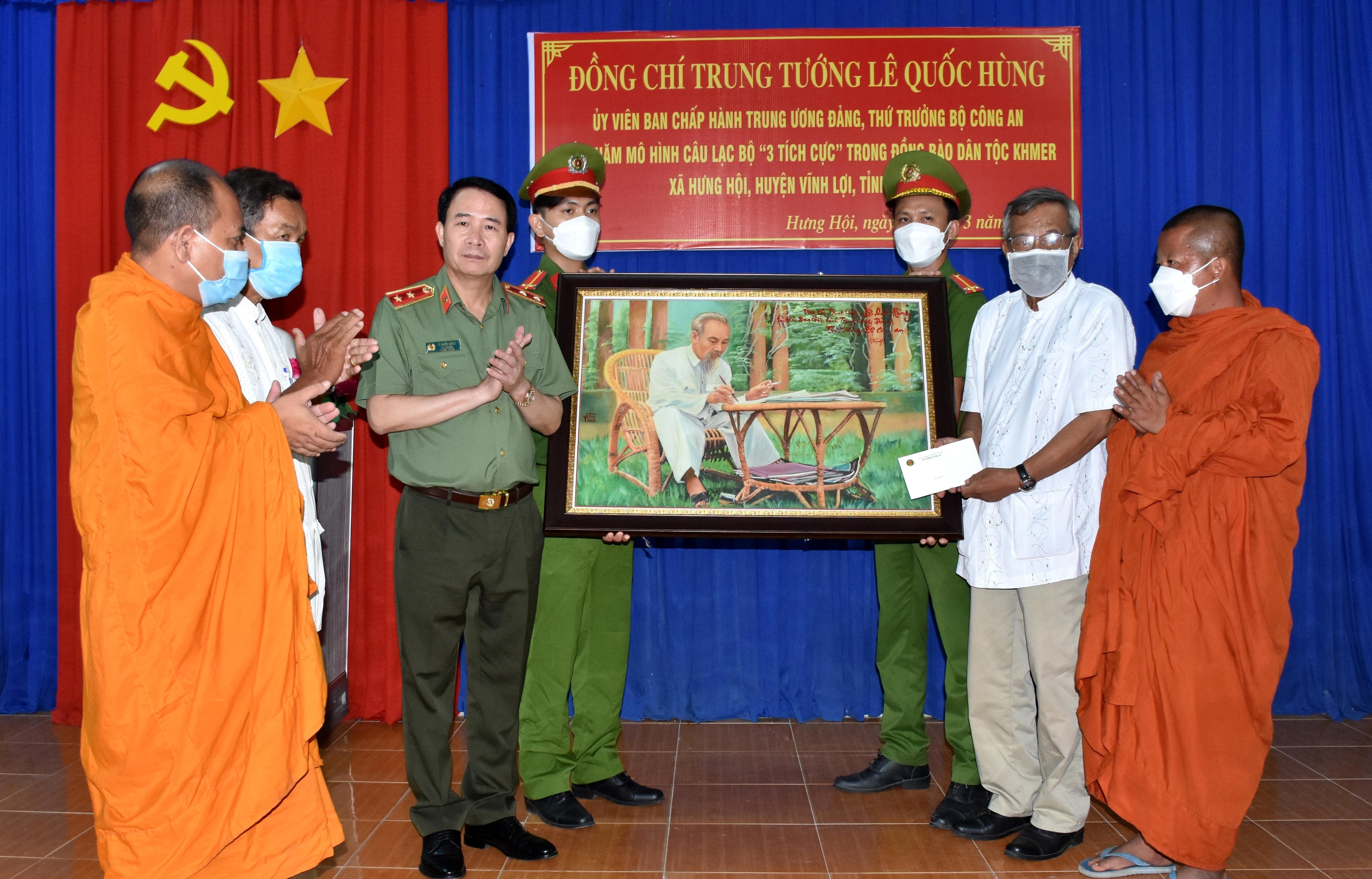 Trung tướng Lê Quốc Hùng - Ủy viên Trung ương Đảng, Thứ trưởng Bộ Công an thăm và tặng quà Câu lạc bộ 3 tích cực trong đồng bào dân tộc Khmer. |