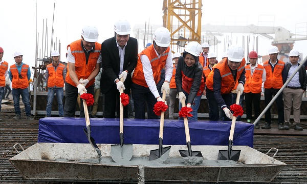 | Đại diện của chủ đầu tư Tập đoàn FLC, đơn vị thi công FLC Faros và Ban quản lý dự án FLC Twin Towers thực hiện nghi lễ cất nóc |