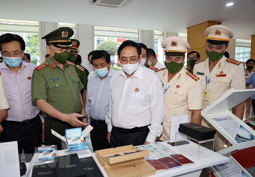 Thủ tướng Chính phủ Phạm Minh Chính cùng các đại biểu tham quan gian trưng bày các thiết bị phục vụ Dự án Cơ sở dữ liệu quốc gia về dân cư. Ảnh: TTXVN |