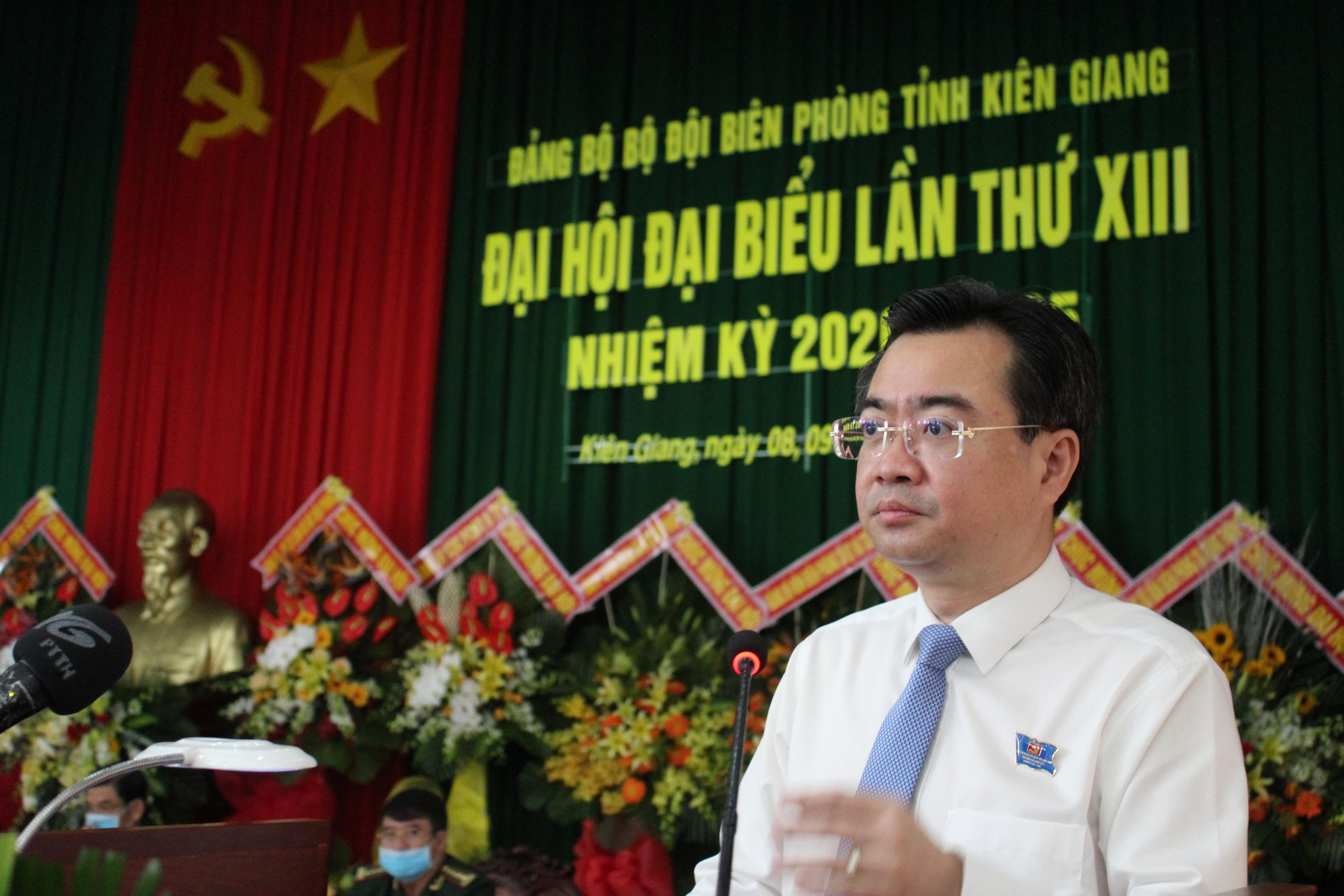 Đồng chí Nguyễn Thanh Nghị - Ủy viên Trung ương Đảng, Bí thư Tỉnh ủy, Trưởng Đoàn đại biểu Quốc hội đơn vị tỉnh Kiên Giang, Thiếu tướng Phùng Quốc Tuấn - Ủy viên Ban Thường vụ Đảng ủy, Phó Chính ủy Bộ đội Biên phòng - đến dự, chỉ đạo Đại hội.
