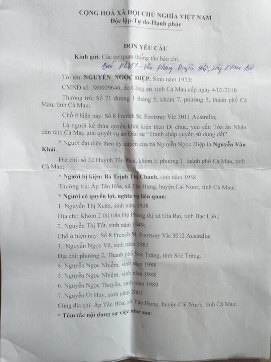 Theo trình bày của bà Điệp, trước đây, cha mẹ bà có khai phá một phần đất với diện tích hơn 1,7ha (tọa lạc tại ấp Tân Hòa, xã Tân Hưng, huyện Cái Nước, Cà Mau) để làm ăn, sinh sống. Đến năm 1961, cha bà Điệp mất, không để lại di chúc, nên mẹ bà quyết định cho chị gái bà là Nguyễn Thị Lợi – người trực tiếp gánh vác các công việc gia đình đứng tên giấy chứng nhận QSDĐ.