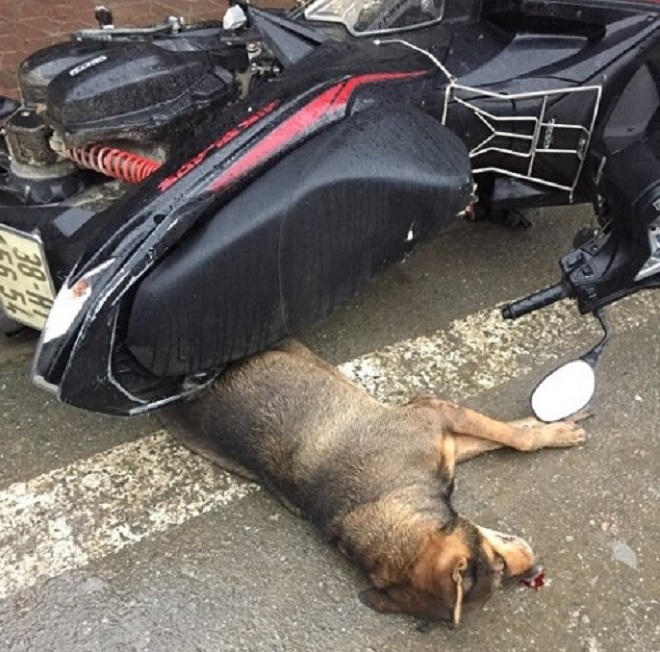 Khi chiếc xe máy bị nghiêng xuống đường thì vô tình đè phải con chó khiến nó bị chết sau đó.
