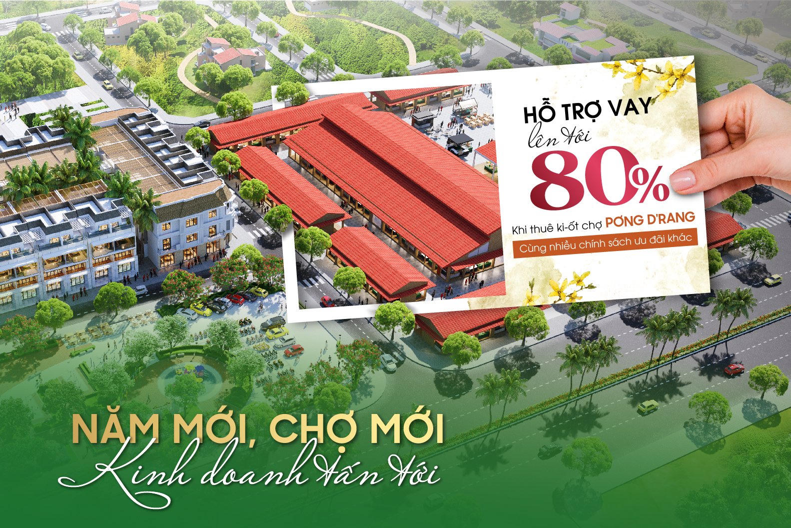 Công ty CP Đô Thị Thông Minh Việt Nam (VNSC) vừa công bố triển khai chương trình “Năm mới, chợ mới – Kinh doanh tấn tới” tại chợ xã Pơng D’rang. Theo đó, tiểu thương chỉ cần đóng 20% giá trị ki-ốt/sạp đã được ký hợp đồng thuê, ngân hàng hỗ trợ vay 80% trong thời hạn tối đa 10 năm và miễn phí trả nợ trước hạn trong 11 tháng.