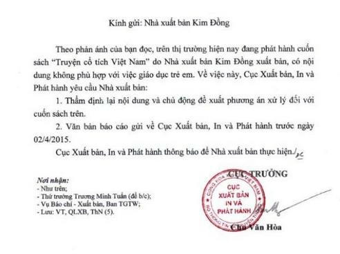 Còn trong công văn 1431/CXBIPH-QLXB gửi riêng cho NXB Kim Đồng, Cục Xuất bản nhắc đến trường hợp sách Truyện cổ tích Việt Nam "có nội dung không phù hợp với trẻ em". Cục yêu cầu NXB Kim Đồng "thẩm định lại nội dung và chủ động đề xuất phương án xử lỷ với cuốn sách trên trước ngày 2/4/2015".
