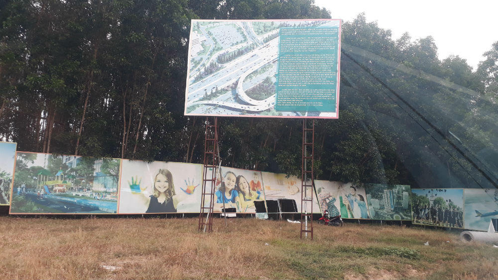 | Những pano quảng cáo một khu đô thị tiện nghi của Công ty Vạn An Phát thuộc huyện Long Thành. Thực tế chỉ có một đoạn đường nhựa và vài cây cột điện không có dây |