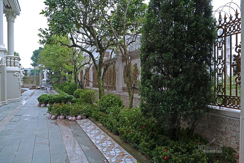 Hệ thống cổng, hàng rào được làm bằng chất liệu nhôm hợp kim mạ đồng. Hai bên có hai tượng sư tử trắng, kích cỡ lớn án ngữ. Hai pho tượng này vừa mang tính chất trang trí, vừa thể hiện sự mạnh mẽ của gia chủ trong cuộc sống và kinh doanh. Đặc biệt, cánh cổng được điều khiển bằng hệ thống từ xa. Ngoài ra, xung quanh gắn 20 camera và lớp hàng rào thép gai để đảm bảo an ninh.
