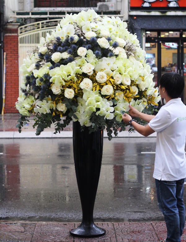 Theo chị Vân, bình hoa 70 triệu đồng của vị đại gia nói trên gồm có hoa hồng trắng nhập khẩu giá 120.000 đồng/cành, lan hồ điệp 350.000 đồng/cành, hoa sao Hà Lan 180.000 đồng/cành và một số lá nhập nhuộm màu vàng, màu bạc. Bình hoa 62 triệu cũng có những loại hoa tương tự kèm theo hoa Allium có giá 350.000 đồng/cành.