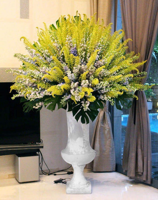 Bình hoa 85 triệu đồng được làm từ hơn 500 cành hoa Phi yến Delphinimum màu xanh đặc biệt giá từ 120.000 – 150.000 đồng/cành, loại hoa này dài trên 1m. Ngoài ra, bình hoa khủng cũng được làm bằng những bông hoa đuôi chồn nhập khẩu cao từ 1 – 1,2m và có giá từ 400.000 – 500.000 đồng/cành.