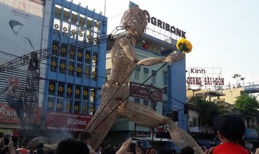 Sự xuất hiện của chú Rối khổng lồ khiến người dân và du khách ùa ra đường xem rất đông.