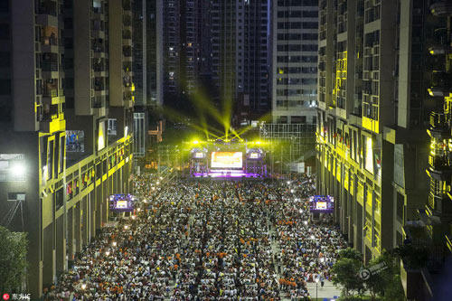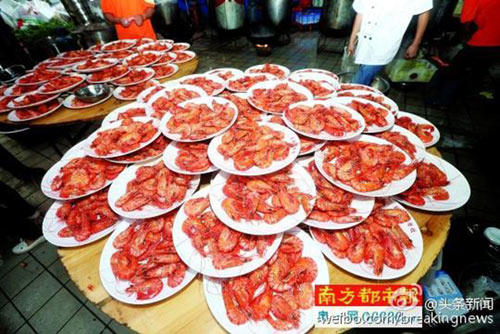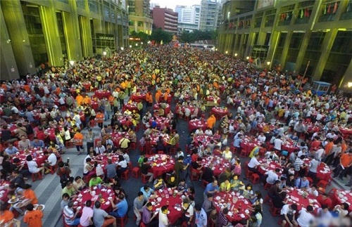 Bữa tiệc khổng lồ do tập đoàn kinh doanh bất động sả Phú Lực tổ chức ngoài trời này diễn ra chiều ngày 2/10 tại thôn Dương Kỳ, ngoại thành Quảng Châu.