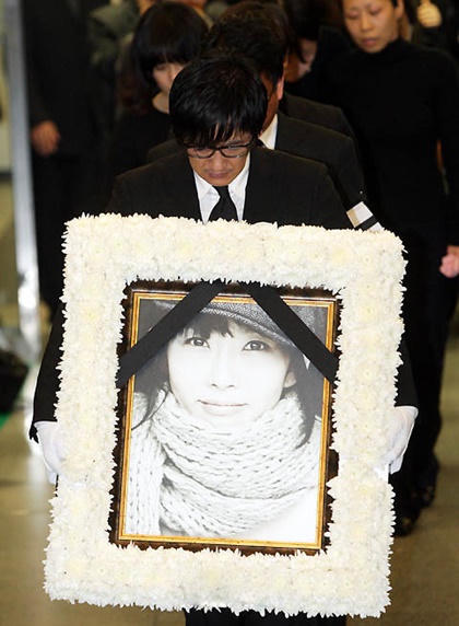 Ca sĩ, diễn viên Choi Jin Youngcầm di ảnh của chị gái trong tang lễ, anh cũng tự tử năm 2010. |