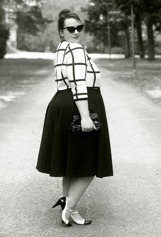 Nếu bạn là một cô nàng tiệc tùng, muốn diện những chiếc áo len mỏng, ánh kim lấp lánh... vậy hãy kết hợp với một chiếc chân váy xòe, cạp cao một chút. Phần xòe của váy giúp che đi phần bụng dưới béo của mình.