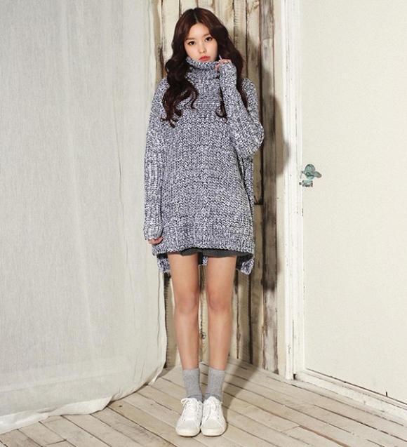 Phần bụng béo được che đi khéo léo nhờ vạt áo dài. Với áo len dáng suông bạn có thể mặc thành váy hoặc áo đều được.