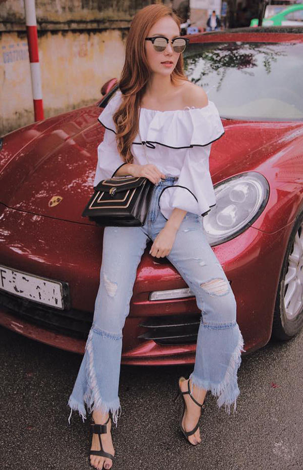 Áo trễ vai phối đường viền tương phản màu sắc được ca sĩ kết hợp cùng quần jean xé gấu và các phụ tiệp sắc đen.