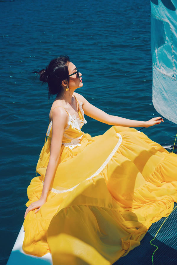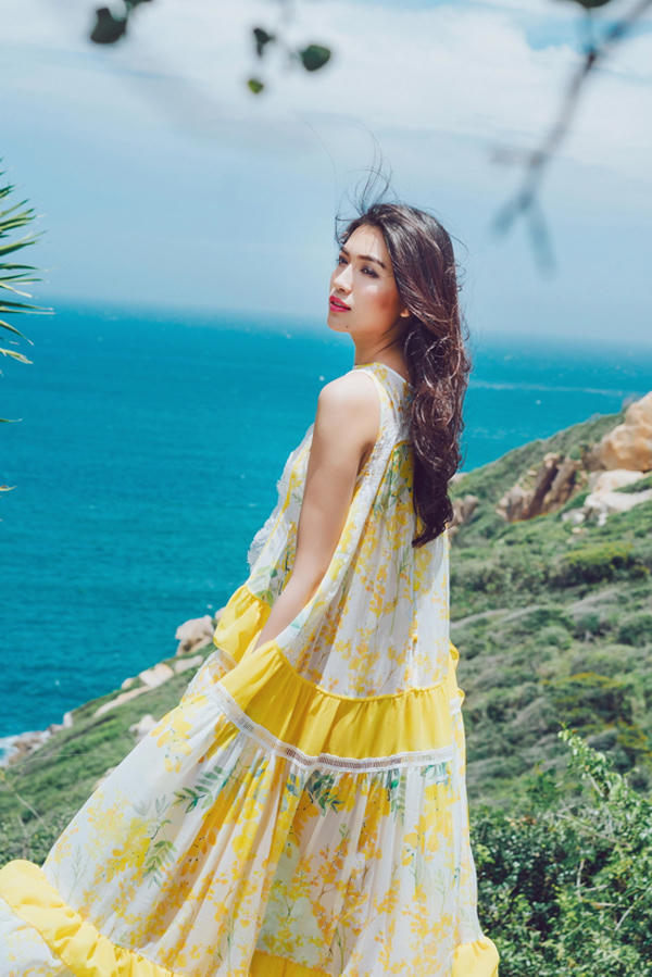 Hòa mình vào không gian xanh biếc của bầu trời và biển cả, á hậu Lệ Hằng giúp mình nổi bật với váy hai dây tông vàng mù tạt.