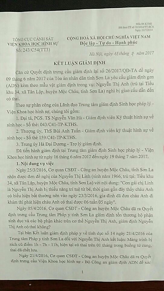 Kết luận giám định này cũng ghi rõ “lưu kiểu gen của Nguyễn Thị Anh (mẹ thai nhi) và Nguyễn Văn Thắng (người cha nghi vấn) tại Viện KHHS”. Ngoài ra, kết luận giám định cũng cho biết, sau khi giám định xong, Viện KHHS đã hoàn lại toàn bộ mẫu vật giám định về Cơ quan Cảnh sát điều tra Công an huyện Mộc Châu, tỉnh Sơn La.