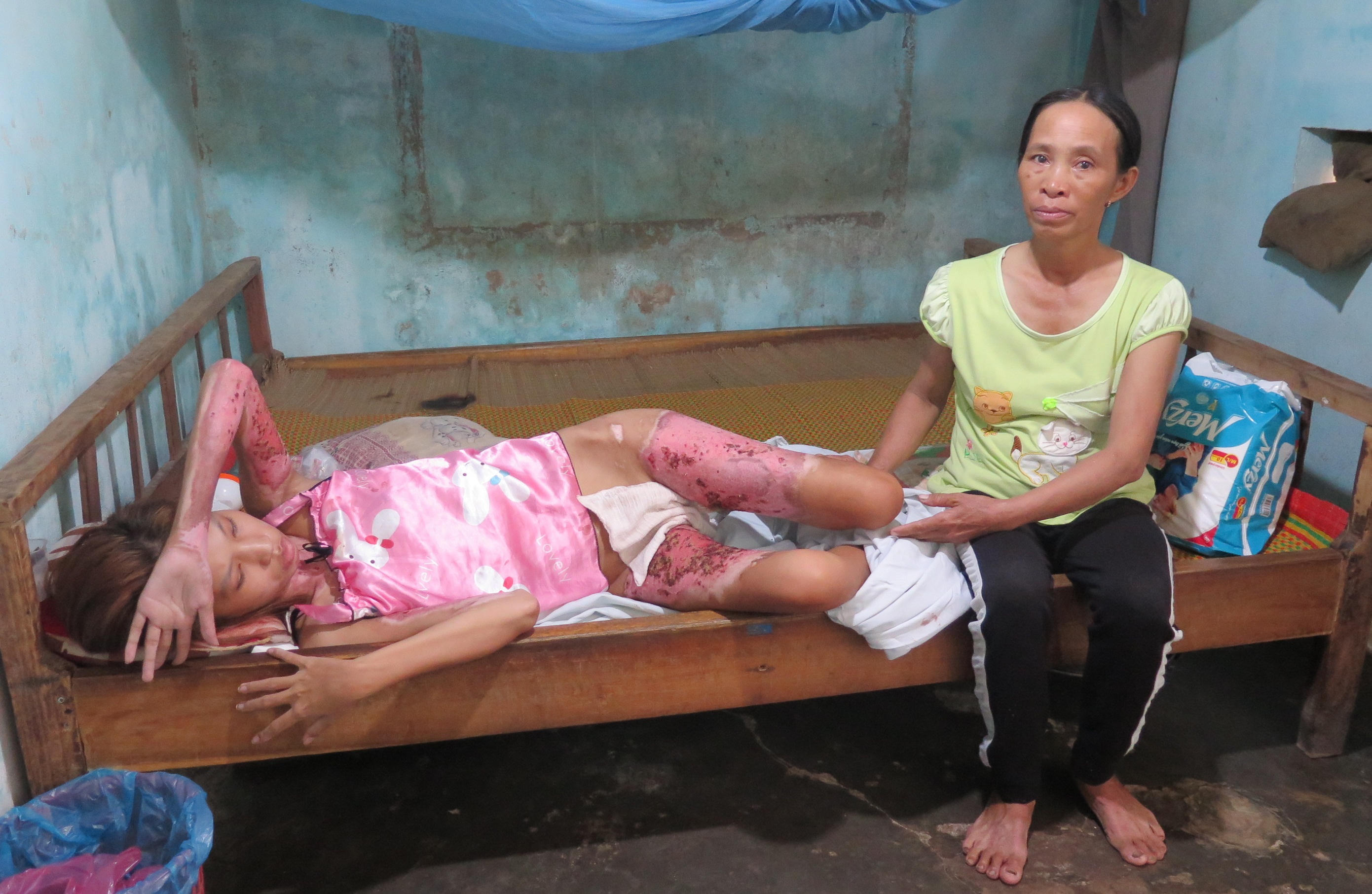Theo hồ sơ bệnh án, chị Thắm nhập viện trong tình trạng bị bỏng độ 1 đến độ 3 ở đùi, tay, cổ, ngực, bụng, lưng, khoảng 60% diện tích cơ thể. Hiện chị Thắm đã qua cơn nguy kịch nhưng theo các bác sĩ, nạn nhân cần phải nằm viện một thời gian dài nữa để chữa lành hẳn vết bỏng và điều trị phục hồi. Tuy nhiên, do kinh tế khó khăn nên ngày 28/8, gia đình đã xin đưa Thắm về nhà để hàng ngày tự chăm sóc, rửa vết thương.