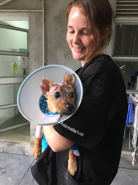 Bác sỹ Alane Cahalane, chuyên gia phẫu thuật từ Bệnh viện Chuyên khoa Thú y Hong Kong, người từng tư vấn và phẫu thuật trên các cá thể gấu của Tổ chức Động vật Châu Á, đã bay tới một ngày để thực hiện ca phẫu thuật đầu tiên của Tuffy để tách phần chân và mí mắt bị dính liền.