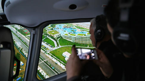 | Khách hàng chăm chú ngắm nhìn và chụp ảnh Quần thể FLC Sầm Sơn và khu biệt thự biển FLC L’Amoura từ trên trực thăng. |