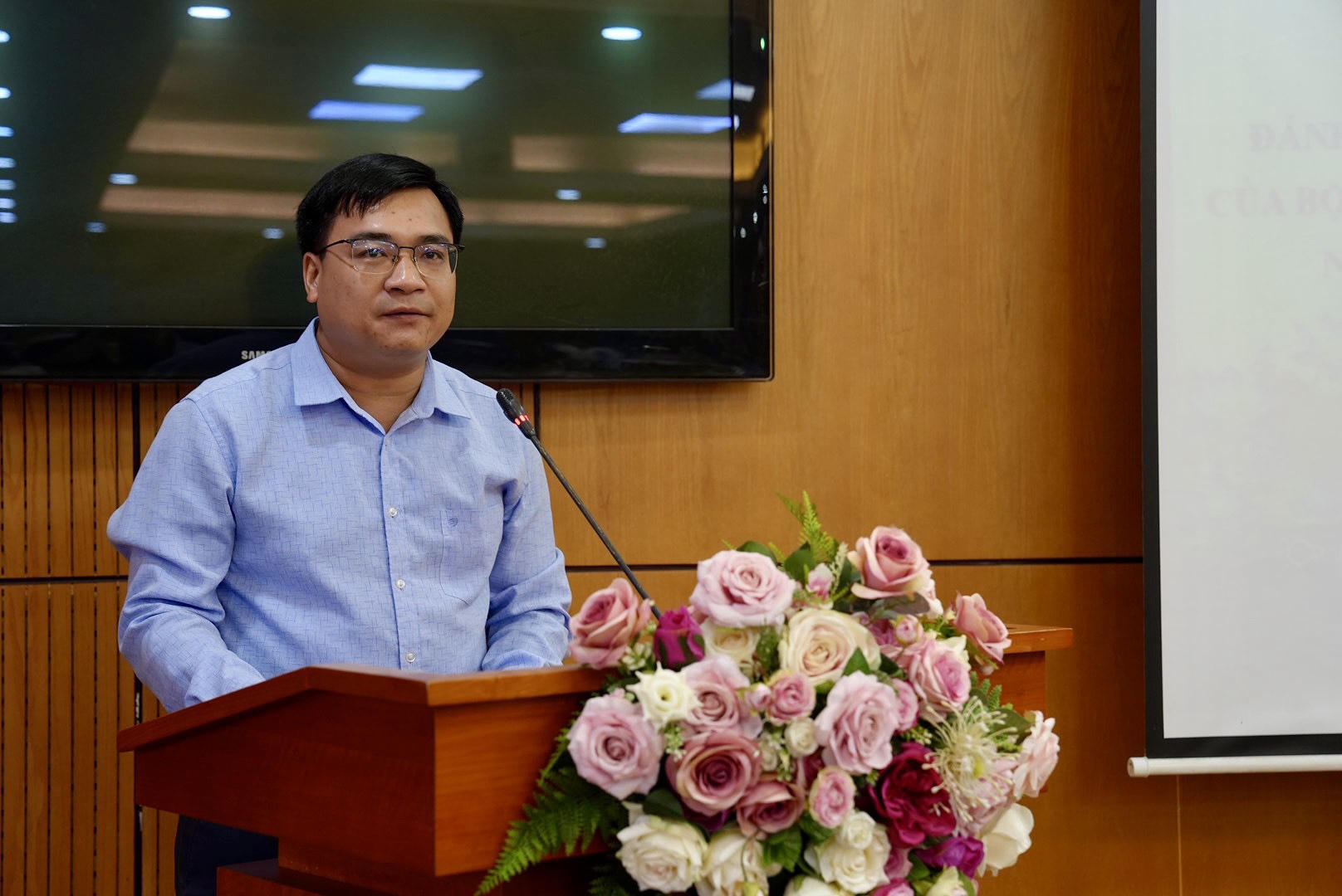Phó Chánh Văn phòng Bộ Lê Tuấn Phong trình bày báo cáo tại Hội nghị. |