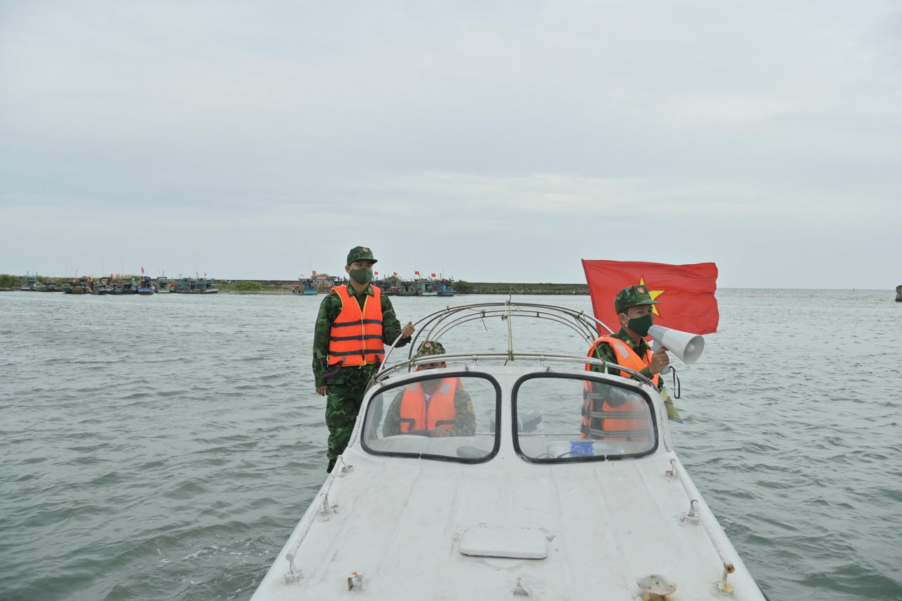 Tổ công tác đồn Biên phòng Xà Lực, kêu gọi ngư dân neo đậu đúng nơi quy định để phòng, chống giông, bão... |