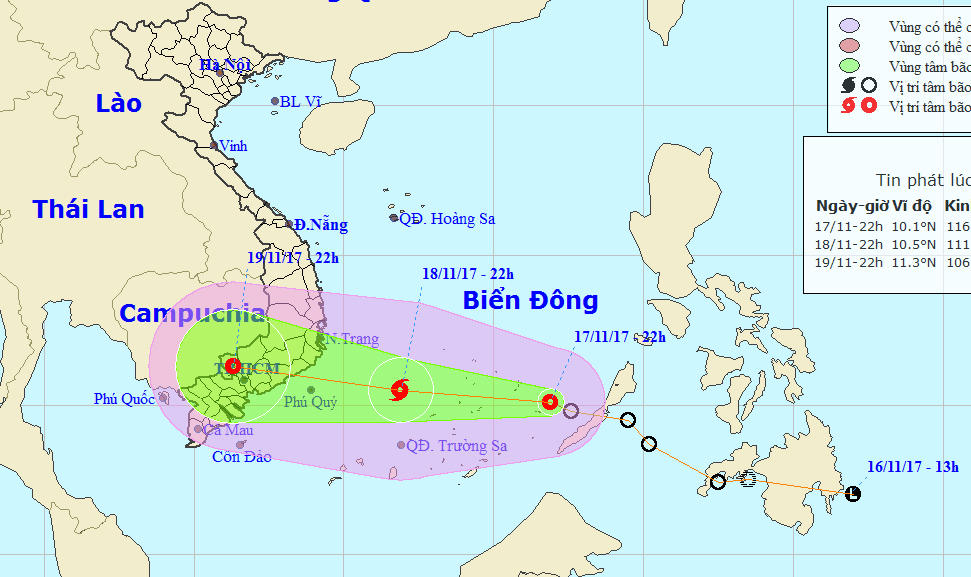 Trung tâm Dự báo Khí tượng Thủy văn trung ương dự báo trong 24 giờ tới, áp thấp nhiệt đới di chuyển theo hướng Tây Tây Bắc, mỗi giờ đi được 25-30km và có khả năng mạnh lên thành bão. Đến 22h ngày 18/11, vị trí tâm bão ở vào khoảng 10,5 độ Vĩ Bắc; 111,9 độ Kinh Đông cách đảo Phú Quý khoảng 310km về phía Đông. Sức gió mạnh nhất ở vùng gần tâm bão mạnh cấp 8 (60-75km/giờ), giật cấp 11.