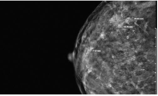 Tại đây, bác sĩ tiến hành thăm khám lâm sàng và chỉ định xét nghiệm cùng các thăm dò chẩn đoán hình ảnh như: siêu âm, chụp X-quang tuyến vú. Kết quả siêu âm vú phát hiện hai khối u tuyến vú phải đều nghi ngờ ác tính. Đặc biệt, hình ảnh chụp X-quang cho thấy hiện tượng vi vôi hóa lan tỏa tuyến vú phải kèm vài hạch vùng hố nách.