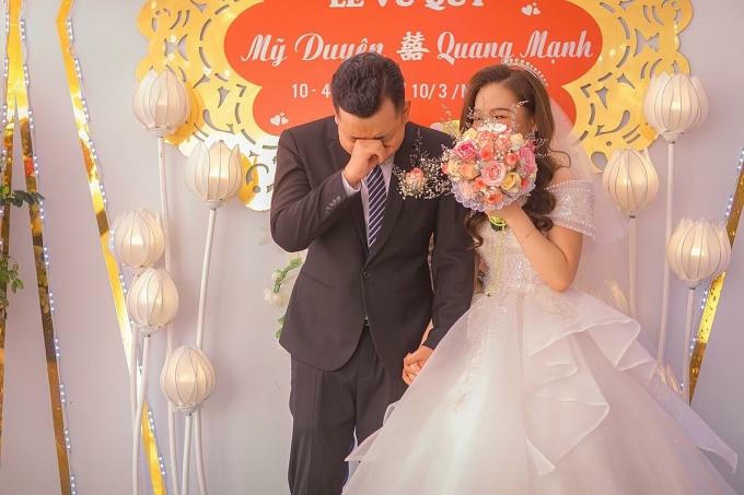 Tình huống này khiến người thân và cô dâu cũng bất ngờ bởi trước hôn lễ, Mạnh còn liên tục nhắc vợ "đừng khóc trong đám cưới sẽ kém xinh". Cô dâu Mỹ Duyên đành nán lại thêm vài phút để chú rể lắng dịu cảm xúc và kìm cơn khóc rồi mới cùng chồng bước xuống nhà làm thủ tục cho hôn lễ ở TP Bắc Giang, hôm 10/4.