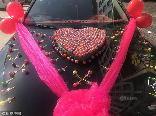 Chú rể Xiaoqiang vốn là chàng trai lãng mạn, nên muốn tạo bất ngờ cho cô dâu. Chiếc xe dâu kẹo mútkhiến cô dâu cảm động. Ảnh:Sina. |